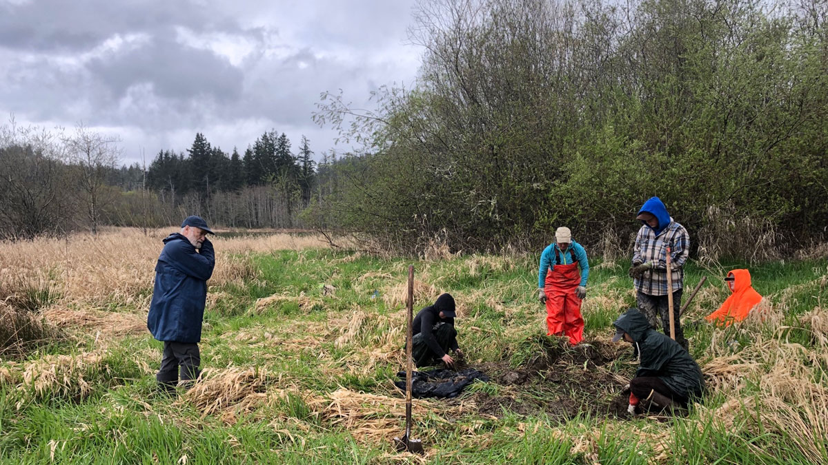 Wildlife biologist Dave Rugh looks on as interns, with Land Trust staff members, Cristina and Carrie, dig yellow flag iris at Donovan Creek Wetland Preserve.